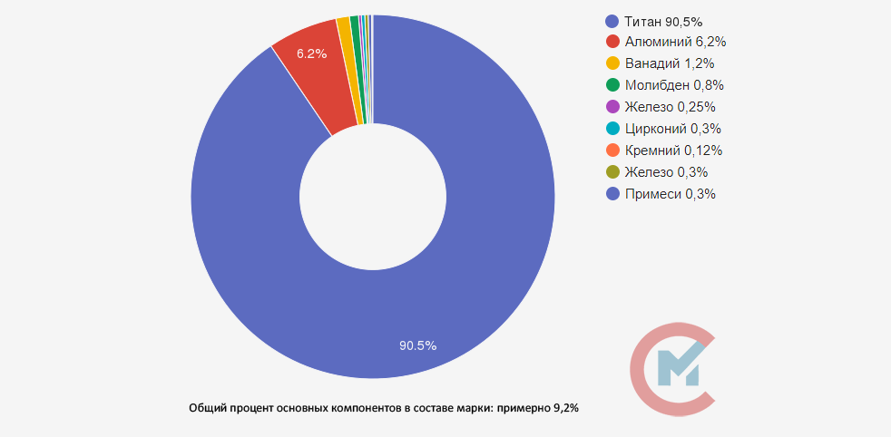 В основном сплав состоит из титана (Ti) в процентном соотношении от 92,385% до 95,7%. Суммарное содержание примесей в сплаве до 0,3%: железо (Fe) до 0,3%, углерод (C) до 0,1%, кремний (Si) до 0,15%, азот (N) до 0,05%, алюминий (Al) от 4,3% до 6,2%, цирконий (Zr) до 0,3%, кислород (O) до 0,2%, водород (H) до 0,015%.
